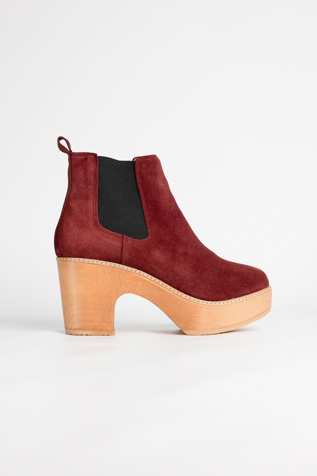 Avec sa ligne sobre et son cuir velours grenat intense, la YELSEA VELVET GRENA revisite la classique Chelsea boot en version sabot. Confectionnée en croûte de vachette velours, doublée en cuir pleine fleur, elle allie douceur visuelle, confort de marche et allure affirmée.